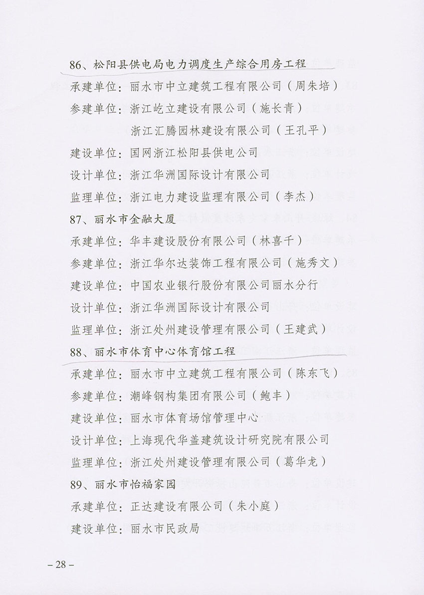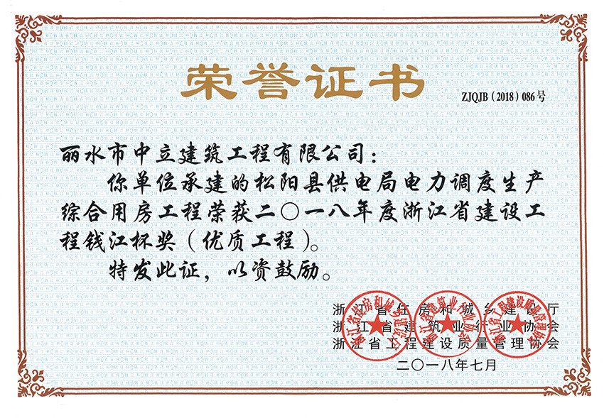 喜報!近日,省建設廳頒發了2018年度浙江省建設工程“錢江杯”(優質工程)文件,我公司“麗水市體育館體育中心工程、松陽縣供電局電力調度生產綜合用房工程”分別獲得2018年度“錢江杯”(優質工程)獎。