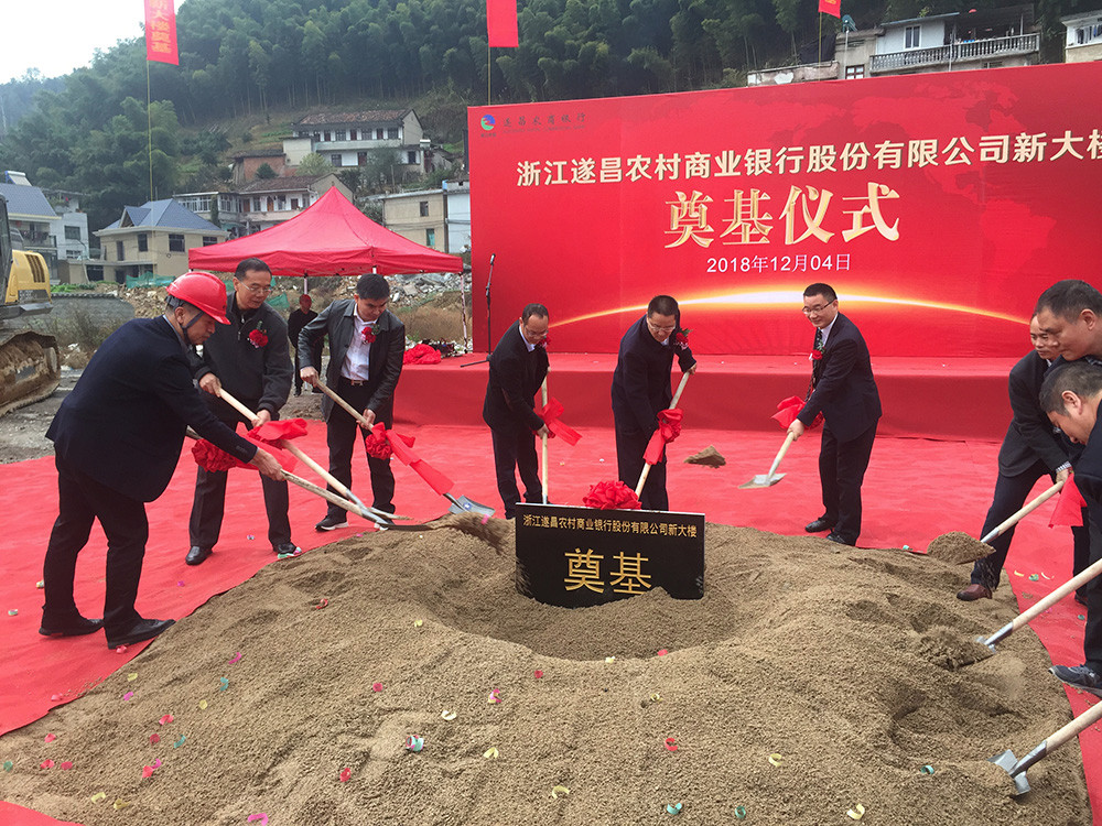 2018年12月04日上午,我司承建的遂昌農村商業銀行辦公大樓工程順利舉行開工奠基儀式。參加儀式的有:遂昌縣委常委、常務副縣長許積標,省農信聯社麗水辦事處副主任方曙,遂昌縣發展和改革局局長潘光明,遂昌縣住房和城鄉建設局局長徐根耀,遂昌縣國土資源局局長周世岳,中國人民銀行遂昌腳支行行長林衛平,遂昌農商銀行董事長余振榮等領導。我司總經理鐘鳴在開工儀式上發言:努力把遂昌農村商業銀行辦公大樓項目建成質量一流的優質工程、樣板工程。